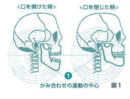 成人の頭はボウリングのボール程度の重さがありますが、首の骨と筋肉の微妙なバランスによって支えられています。頭を支える首の骨には、かみ合わせの運動の中心 (図1参照)があり、ここを中心とした円の上で、顎は上下左右に動きます。かみ合わせが悪いと、運動の中心である首の骨が歪み、微妙なバランスが崩れ、頭を正しく支えられず、姿勢が悪くなってしまうのです。
