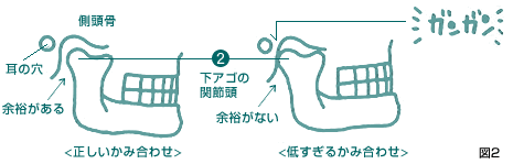 また、かみ合わせが低くなると、下顎の関節頭 (図2参照:手を耳の前に当て、口を開閉させると動くところ)が、頭の骨の"側頭骨"にガンガンぶつかるようになり、口が開きにくくなったり、カクカクと音がするようになります。 |